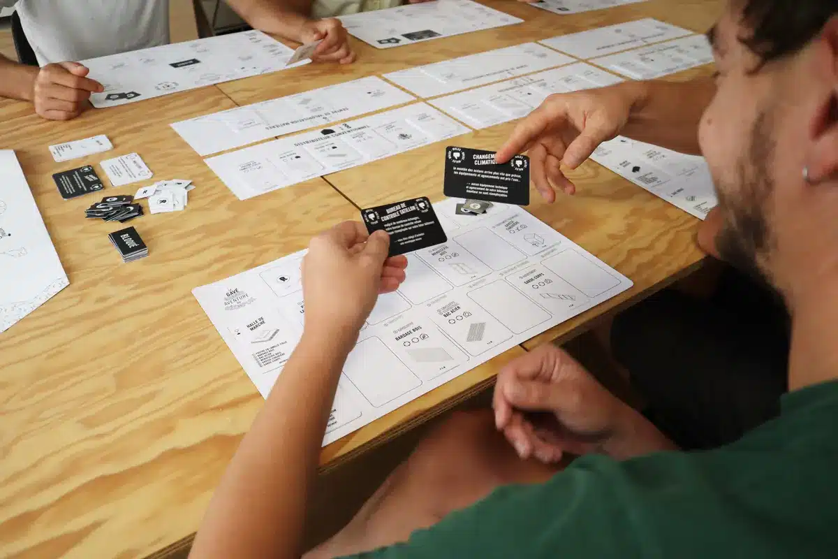 Notre atelier s’appuie sur “La gavé grande aventure de réemploi”. Créé par le Collectif Cancan, il permet d’aborder, par la mise en situation, les grands enjeux du réemploi : réutilisation de matériaux, valorisation de ce qui ne peut pas être réemployé, et recours au neuf lorsque c’est nécessaire. Ce format permet d’ouvrir la discussion, partager des retours d’expérience et questionner, collectivement, les leviers opérationnels du réemploi.